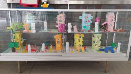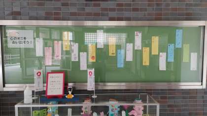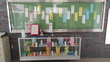 上の掲示板が3年生、下の掲示ケースが2年生の作品です。