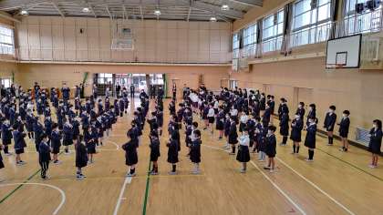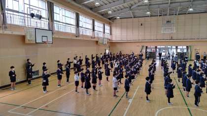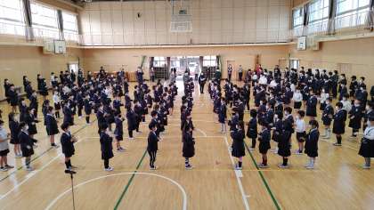 感染症対策のため、校歌を声を出して歌うのではなく、全校児童が内側に向き合って、これまで練習してきた「校歌の手話歌」を披露しました。