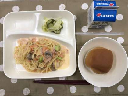 本日の献立は、鮭のクリームスパゲッティ、キャベツときゅうりのサラダ、パン、牛乳です。