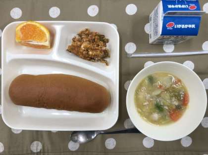 本日の献立は、豆腐のミートグラタン、押し麦と野菜のスープ煮、黒糖パン、デコポン、牛乳です。