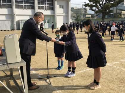続いて、昨日「阿倍野区民ホール」で開催された「大阪市こども文化祭」に出場した児童のみなさんに「第39回 大阪市こども文化祭 出場記念盾」を伝達しました。
