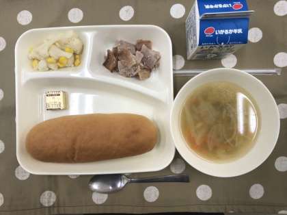 本日の献立は、豚肉のガーリック焼き、カリフラワーとコーンのサラダ、スープ、コッペパン、バター、牛乳です。