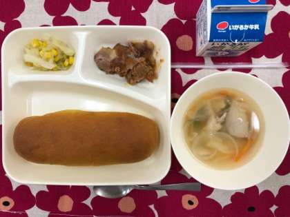 本日の献立は、豚肉のデミグラスソース、キャベツとコーンのソテー、スープ、パンプキンパン、牛乳です。