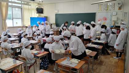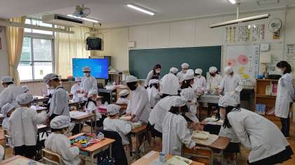 今週月曜日から、6年生が1年生の配膳をしてくれていますが、今日からは、6年生の皆さんが、1年生に配膳の仕方を教えてくれています。
