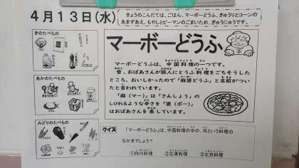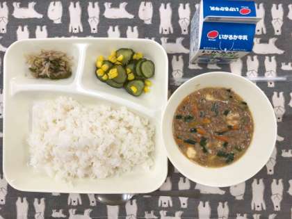 本日の献立は、麻婆豆腐、きゅうりとコーンの甘酢和え、もやしとピーマンの胡麻炒め、ごはん、牛乳です。