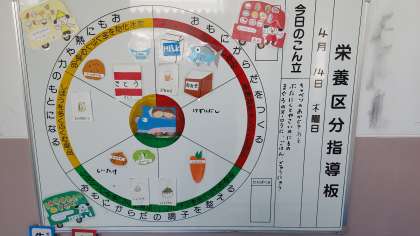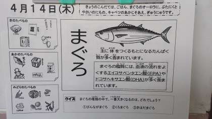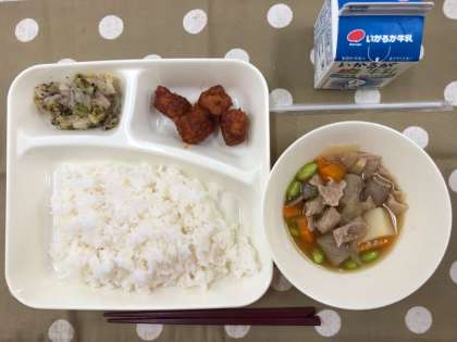 本日の献立は、まぐろのオーロラ煮、豚肉と野菜の煮物、キャベツの赤紫蘇あえ、ごはん、牛乳です。