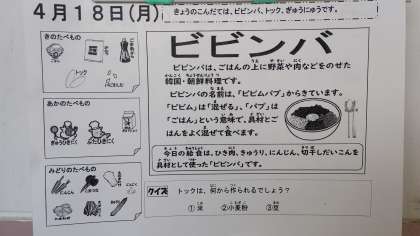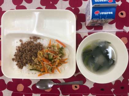 本日の献立は、ビビンバ、トック、牛乳です。韓国・朝鮮料理です。