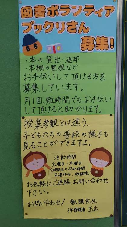 保護者の皆様、図書ボランティア「ブックリさん」にご協力くださいますようお願いいたします。