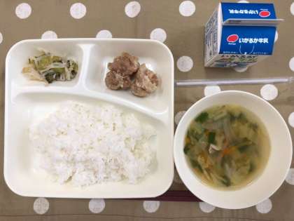 本日の献立は、鶏肉のから揚げ、チンゲンサイともやしの甘酢和え、中華スープ、ごはん、牛乳です。