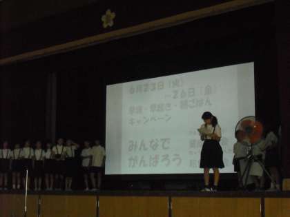来週からの早寝・早起き・あさごはんのキャンペーンに向けて、発表をしました。自分の睡眠や朝ごはんをクイズ形式で振り返りました。自分でできることは実践できる力をつけましょう。