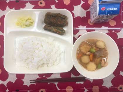 本日の献立は、ちくわの磯部あげ、厚揚げと里芋の味噌煮、あっさりキャベツ、ごはん、牛乳です。