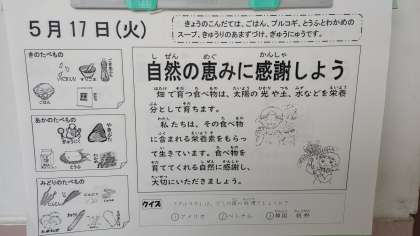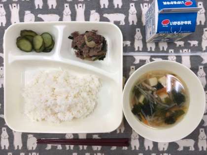 本日の献立は、プルコギ、豆腐とわかめのスープ、きゅうりの甘酢づけ、ごはん、牛乳です。