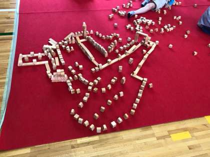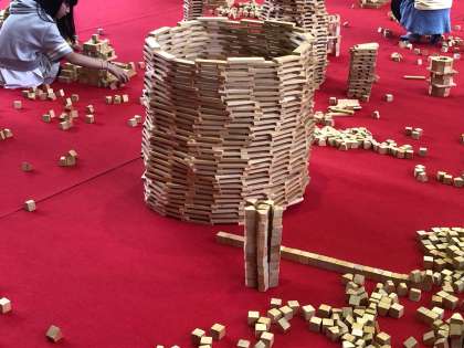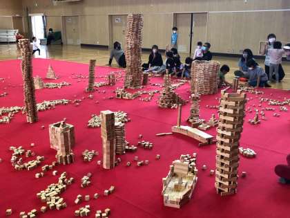 めあては、「2万個のヒノキのつみ木をつかって、つみ木のまちをつくろう」です。