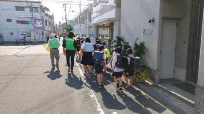 今日は、玉出西地域を回らせていただきました。たくさんの子どもたちが集団登校しています。