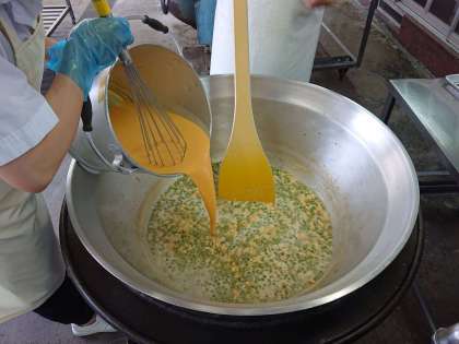 鶏のひき肉を出汁で煮て卵でとじると、出汁のきいた美味しい「えんどう豆の卵とじ」ができました。