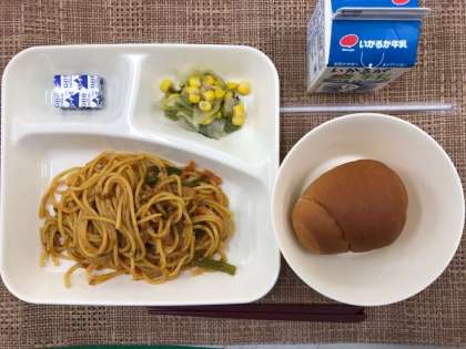 本日の献立は、カレースパゲッティ、レタスとコーンのサラダ、固形チーズ、黒糖パン(小)、牛乳です。