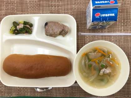 本日の献立は、カツオのガーリックマヨネーズ焼き、グリーンアスパラガスとベーコンのソテー、スープ、黒糖パン、牛乳です。