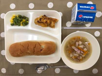 本日の献立は、鶏肉のカレーマヨネーズ焼き、さんど豆とコーンのサラダ、てぼ豆のスープ、おさつパン、牛乳です。