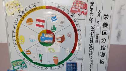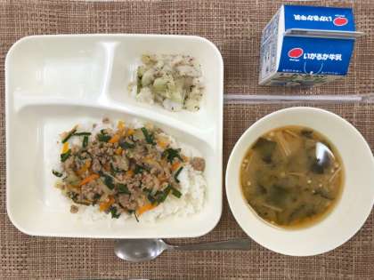 本日の献立は、豚ひき肉とにらのそぼろ丼、キャベツの赤じそあえ、味噌汁、牛乳です。