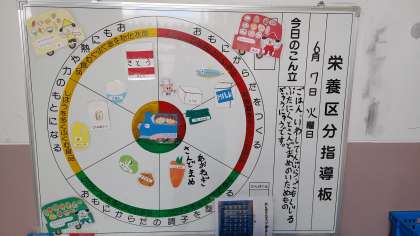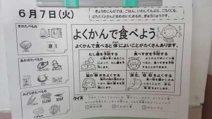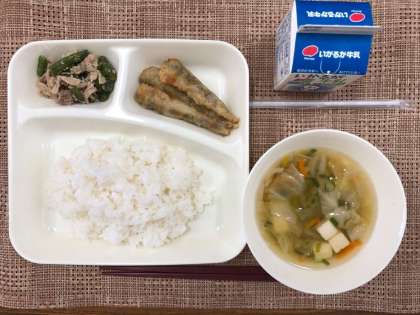 本日の献立は、いわしの天ぷら、豚肉と三度豆の炒め物、五目汁、ごはん、牛乳です。