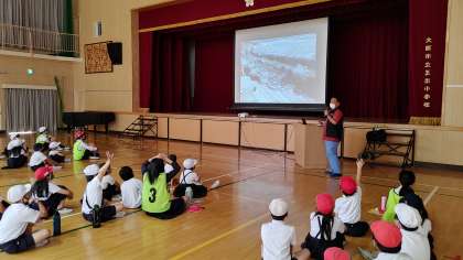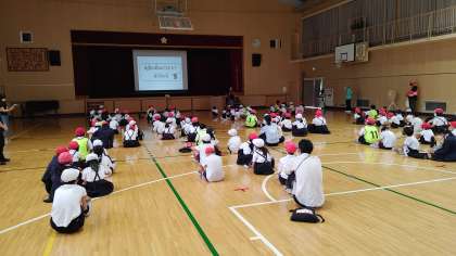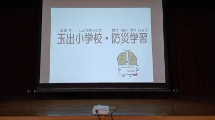 3時間目の、1〜12班の講堂での区役所の方による防災学習の様子です。