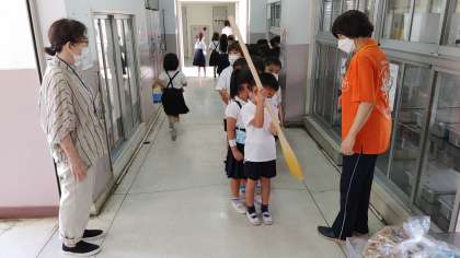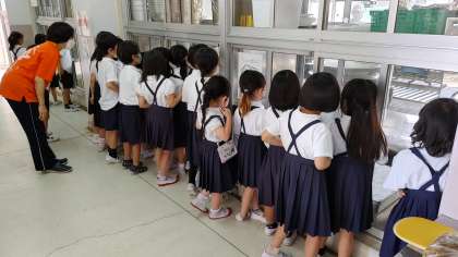 本日3,4時間目に、1年生「きゅうしょくしつ たんけん」を行いました。