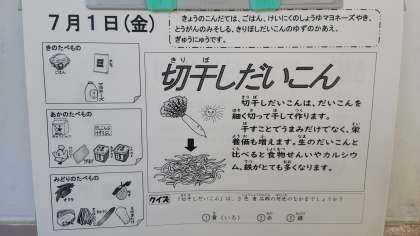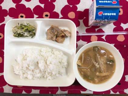 本日の献立は、鶏肉のしょうゆマヨネーズ焼き、切り干し大根の柚子の香和え、冬瓜のみそ汁、ごはん、牛乳です。