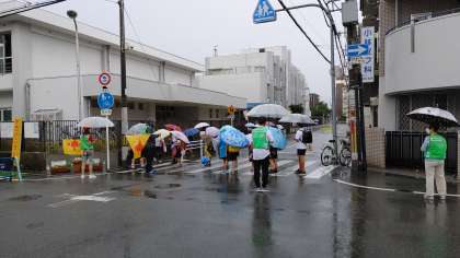 子どもたちの集団登校を見守ってくださる皆様、今日も雨の中をありがとうございます。