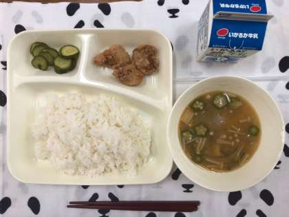 本日の献立は、豚肉の竜田揚げ、きゅうりの甘酢和え、みそ汁、ごはん、牛乳です。
