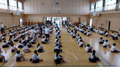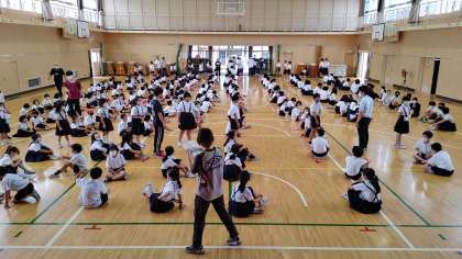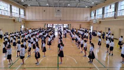 昨日に引き続き、今日も朝の学活の時間に、全校写真撮影の並び方練習を行いました。