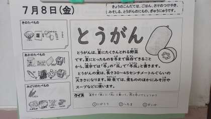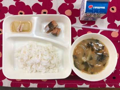 本日の献立は、鮭のつけ焼き、冬瓜の煮物、みそ汁、ごはん、牛乳です。