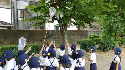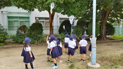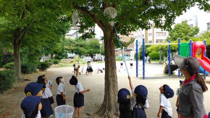 本日2時間目に、1年生の皆さんは学校の隣の玉出南公園に「せみとり」に行きました。