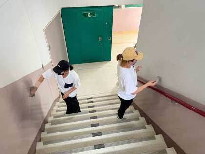 夏季休業中の前半に、教職員で、各教室のカーテン、換気扇、扇風機をきれいに洗い、油引きをしました。
