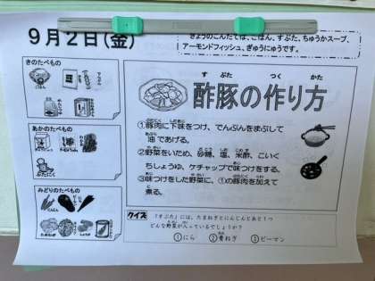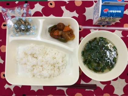 本日の献立は、酢豚、中華スープ、アーモンドフィッシュ、ごはん、牛乳です。