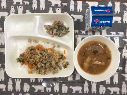 本日の献立は、他人丼、キャベツの赤じそあえ、冬瓜のみそ汁、牛乳です。