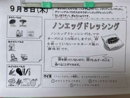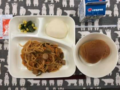 本日の献立は、イタリアンスパゲッティ、グリーンアスパラガスのサラダ(ノンエッグドレッシング)、なし(豊水)、黒糖パン(小)、牛乳です。