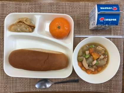 本日の献立は、揚げ餃子、鶏肉と冬瓜の中華煮、黒糖パン、冷凍ミカン、牛乳です。