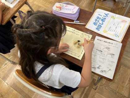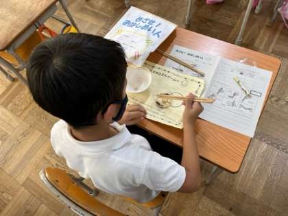 写真は、「めざせ! おはし名人」の様子です。みんな上手に豆をお箸で挟んでお皿に移動させています。