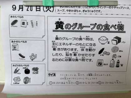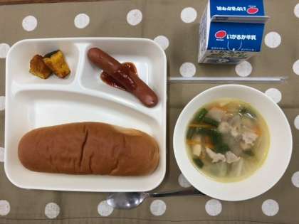 本日の献立は、ウインナーのケチャップソース、焼きかぼちゃ、スープ、黒糖パン、牛乳です。