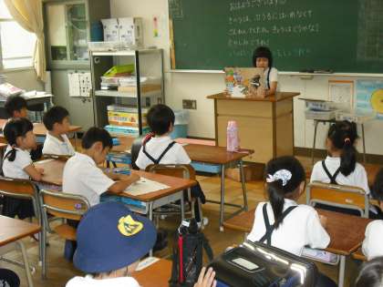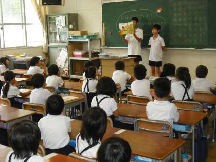 毎週水曜日は読書タイムです。みんなで静かに読書を楽しみます。今、1年生には、図書員会が絵本や紙芝居の読み聞かせをしています。