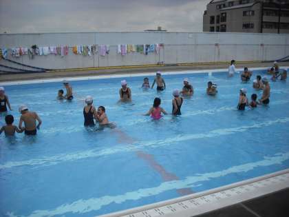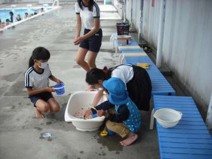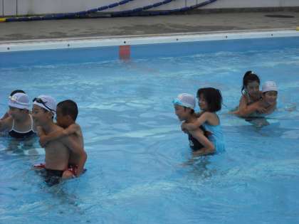 6年生から5年生へのバトンタッチ。玉出幼稚園との交流学習がスタートしました。一回目はプールです。年長児をおんぶして水の中をすいすいと歩く5年生です。
