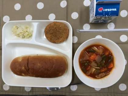 本日の献立は、チキンレバーカツ、ケチャップ煮、キャベツのバジル風味サラダ、おさつパン、牛乳です。