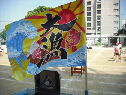 今年の運動会3・4年合同演技はソーラン☆93です。北海道は、最北端の稚内南中学校でアレンジされたソーラン節、アップテンポの曲に全国の学校の運動会でも広く踊られています。玉小の子どもたちがどんなふうに踊りを披露するか当日がとても楽しみですね。写真の大漁旗は川村先生の力作です。
