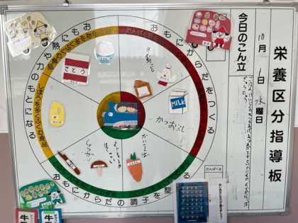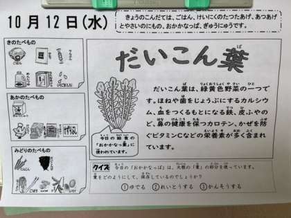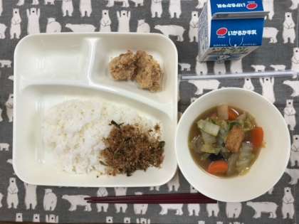 本日の献立は、鶏肉の竜田揚げ、厚揚げと野菜の煮物、おかか菜っ葉、ごはん、牛乳です。