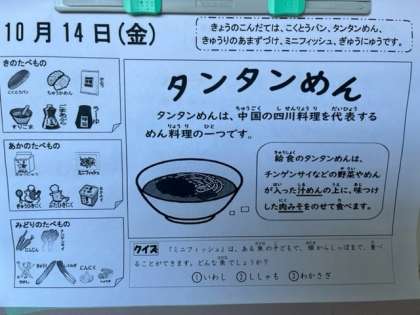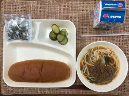 本日の献立は、タンタン麺、きゅうりの甘酢和え、黒糖パン、ミニフィッシュ、牛乳です。