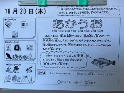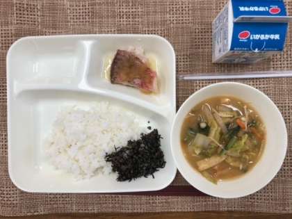 本日の献立は、あかうおのみぞれかけ、牛ひじきそぼろ、みそ汁、ごはん、牛乳です。