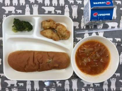 本日の献立は、白身魚フリッター、ブロッコリーのサラダ、ミネストローネ、レーズンパン、牛乳です。