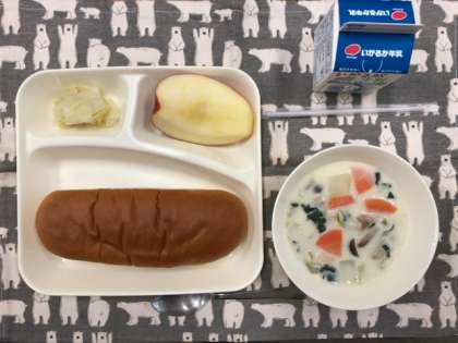 本日の献立は、きのこのクリームシチュー、キャベツのピクルス、黒糖パン、りんご、牛乳です。