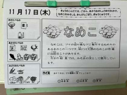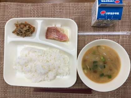 本日の献立は、赤魚の醤油だれかけ、きんぴらごぼう、なめこの味噌汁、ごはん、牛乳です。