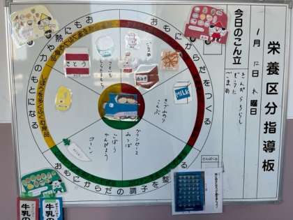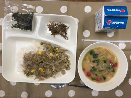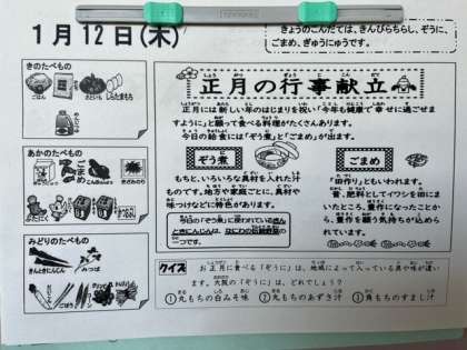 本日の献立は、きんぴらちらし、雑煮、ごまめ、牛乳です。今日は「正月の行事献立」です。とても美味しいです。